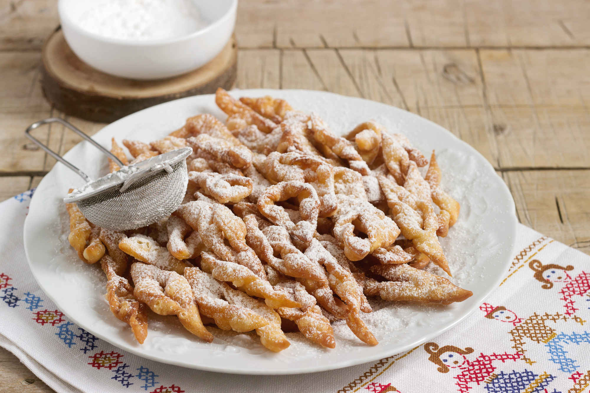 Rozwałkuj bardzo cienko, pokrój w paski, natnij i przełóż końcówkę przez otwór. Smaż w temperaturze 170-180°C, do złotego koloru.